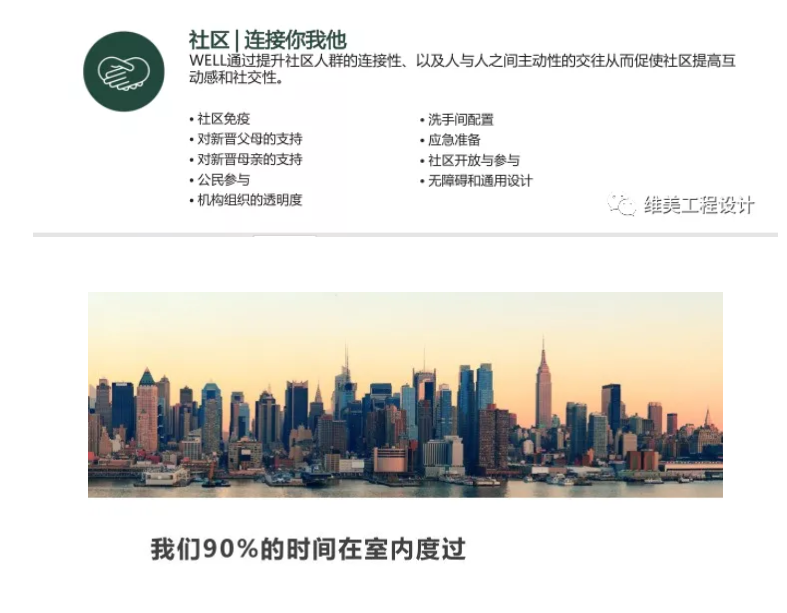 WELL 健康建筑标准? (The WELL Building Standard? ,简称,WELL?) 是帮助全球企业(或机构)通过更健康、更良性的建筑来提升人体健康与福祉的领先工具。WELL是一个全球适用、具有高度灵活性的健康建筑与健康社区衡量与认证系统,旨在帮助公司(或机构)将健康策略纳入其建筑、运营和管理政策的结构中 --- 这可以为员工和企业人群的健康带来切实利益,并协助企业创造更有意义的投资回报。