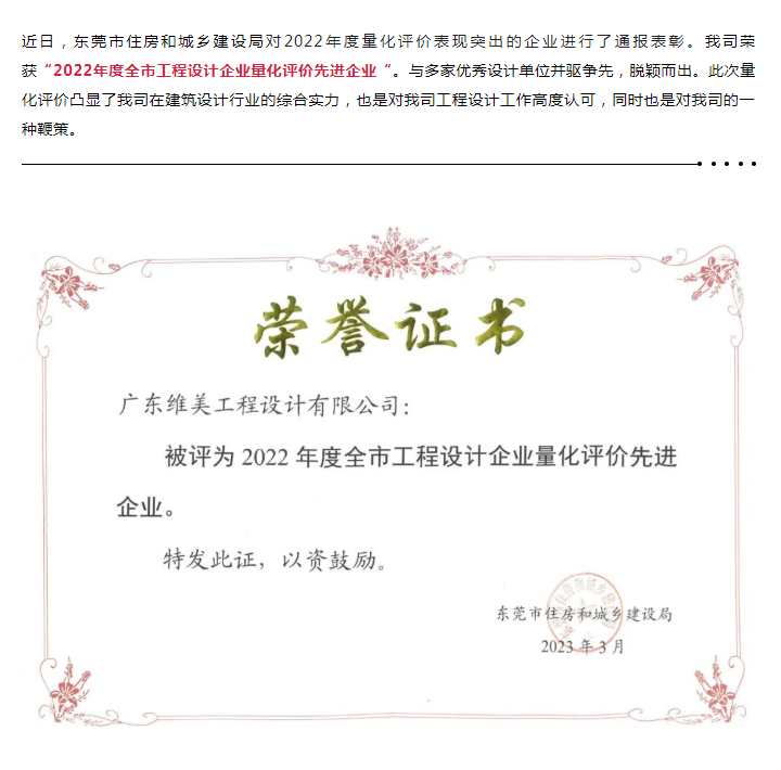 维美.喜讯 | 热烈祝贺我司荣获“2022年度全市工程设计企业量化评价先进企业”